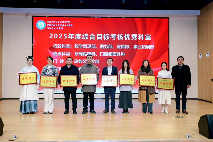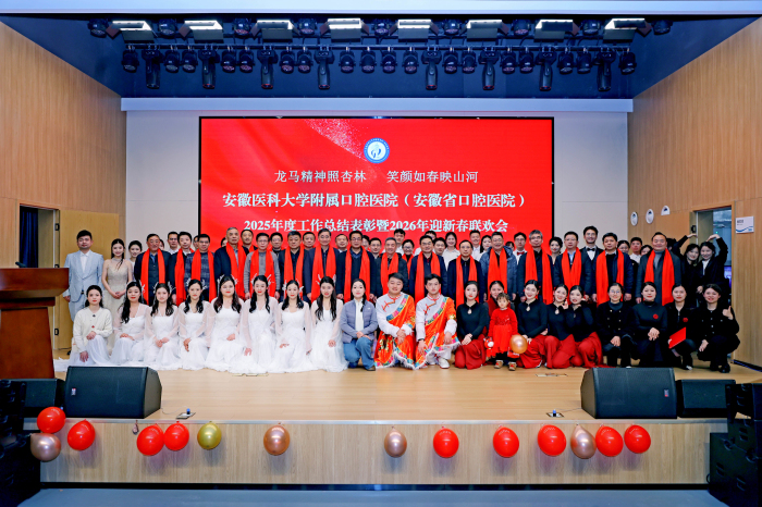院党委书记刘颀致新春贺词。他代表医院党委和行政,向关心支持医院发展的校领导,退休职工以及全体师生医护员工,致以诚挚的感谢与新春的问候。刘颀表示,回首2025年,医院各项工作亮点频现、成绩斐然。2026年是“十五五”规划的开局之年,更是医院发展进程中的关键之年。面对博士点申报、三甲评审两大攻坚任务,全院上下要锚定发展目标,持续坚持“党建领航”把稳方向、“医疗提质”筑牢根基、“科教融汇”增强动能、“管理增效”优化生态,奋力朝着建设国内一流、特色鲜明的高水平医科大学口腔医学院和附属口腔医院的目标迈进。