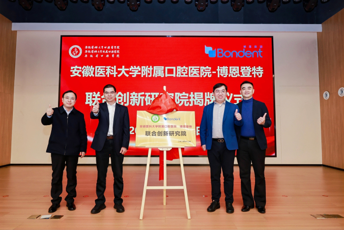 在全场嘉宾的共同见证下,双方代表共同为“安徽医科大学附属口腔医院 - 博恩登特联合创新研究院”揭牌,标志着双方合作迈入新阶段。