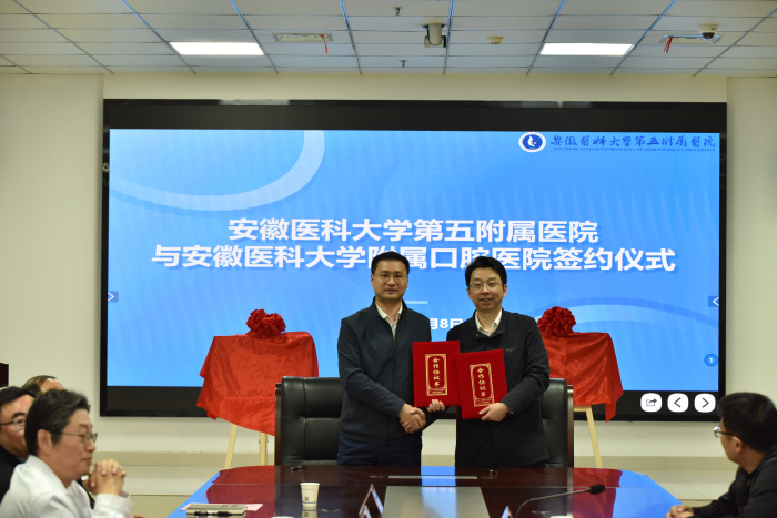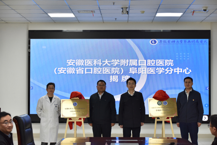 4月8日上午,我院阜阳医学分中心揭牌仪式在安徽医科大学第五附属医院(以下简称安医大五附院)举行。我院副院长徐文华,安医大五附院副院长冯小军,双方相关科室负责人及医护代表参加会议,共同见证这一重要时刻。