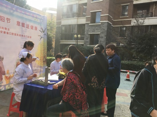 硕果金秋,在党的十九大胜利召开之际,恰逢九九重阳节,“情暖重阳节,意暖送健康”。为方便中老年居民寻医问诊,2017年10月28日,安徽省口腔医院政务区门诊部开展的重阳节义诊进社区活动,在合肥市政务区水墨兰亭小区举行。