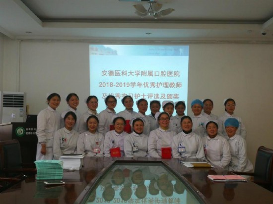 根据日常教学考核及各科推荐、现场投票等多环节综合考评,最终,口腔颌面外科郭皎皎和口腔综合科李玲2位老师荣获“护理优秀教师”称号;安徽医学高等专科学校的许能、石雅婷2位同学荣获“优秀实习生”称号。护理部陈叶俊主任为获奖老师和学生颁奖并合影留念,对大家为护理工作所做出的努力表示感谢。
