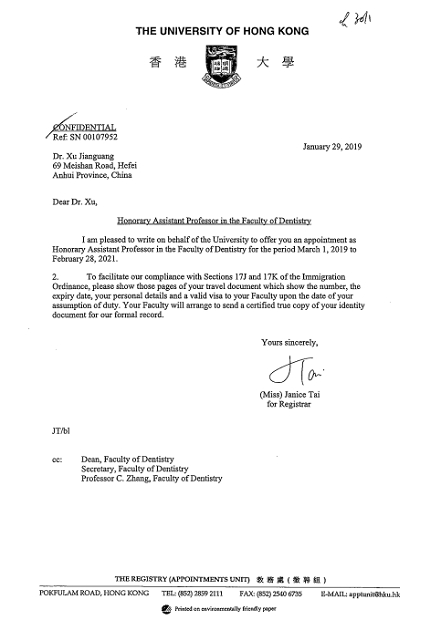 我院正畸科徐建光博士由于在临床、科研、教学等方面的突出成就,于2019年3月被香港大学牙学院聘为荣誉副教授,同时被香港大学提名角逐李嘉诚奖。