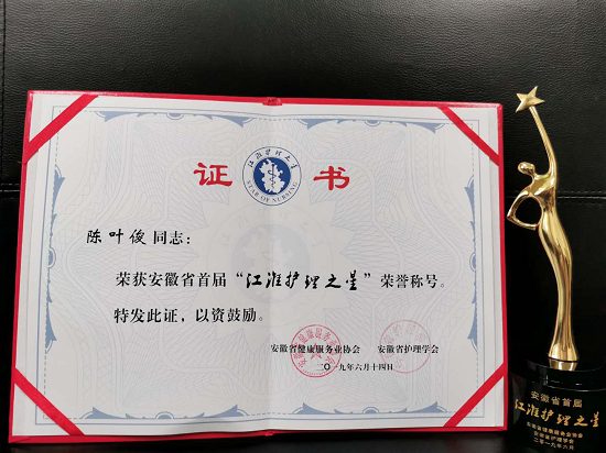 我院护理部主任陈叶俊凭借雄厚的实力和良好的口碑,通过单位推荐、网络投票和专家评议程序,最终脱颖而出,被授予安徽省首届“江淮护理之星”称号。