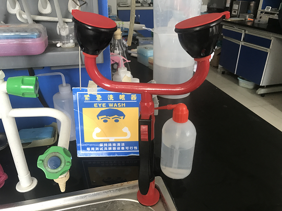 中心实验室现有的两个实验室均已安装洗眼器,当学生在实验过程中眼睛或者身体不慎接触有毒有害以及具有其他腐蚀性化学物质时,可用洗眼器其进行紧急冲洗或者冲淋,避免化学物质对人体造成进一步伤害。
